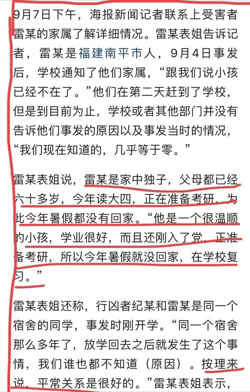 此事曝光,网上就有了受害人的发文,雷某是家中的独子,好不容易考上大学,又准备考研,本以为未来一切光明,结果遇到了发疯室友,直接被捅死了,身上到处的刀伤。最令人可悲的是,雷某的父母都快60岁了,是家里唯一的儿子,顶梁柱没了,真的很担心这对父母会想不开。