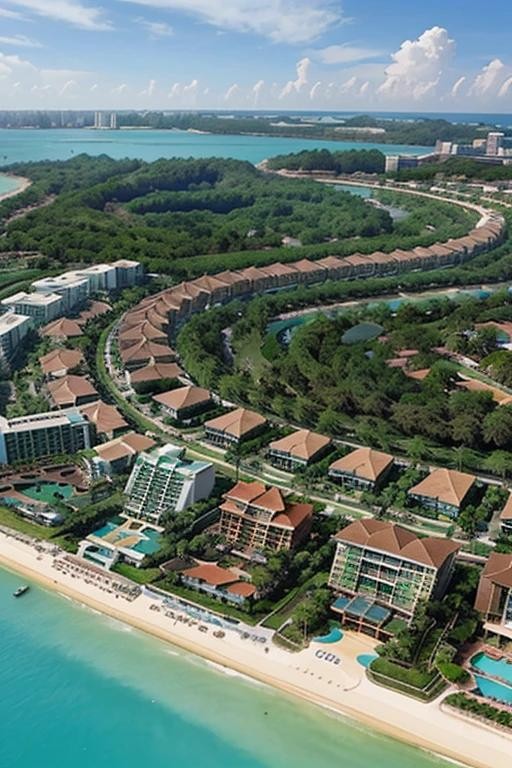 这个度假胜地包括美丽的海滩、主题公园、高尔夫球场和许多娱乐设施。是一个适合家庭休闲度假的地方。