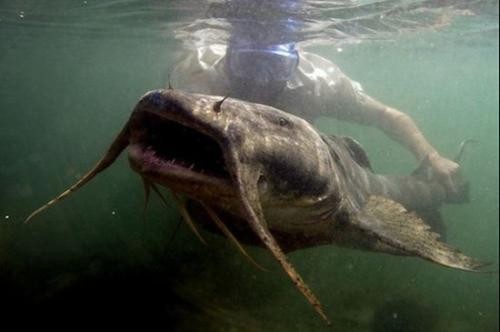坦克鸭嘴鱼 (Goonch Catfish),是一种巨大的捕食性鲶鱼,出现在亚洲大部分地区,尤其是喜马拉雅河流的激流地区、湄公河以及其最大的支流。跟它的鲶鱼亲戚一样,可以长到非常大的体形和体重。不过跟别的鲶鱼不同的是,这种河中怪兽只生活在印度和尼泊尔之间的大卡里河(the Great Kali River)中,这里的河水经常被用于处理印度火葬仪式后的尸体。有理论说,坦克鸭嘴鱼一直在吞食这种火葬后半熟的人类尸体,也许是这种食物帮助坦克鸭嘴鱼----或者至少是这一物种中的一些成员——长到了超乎寻常的巨大体形。
