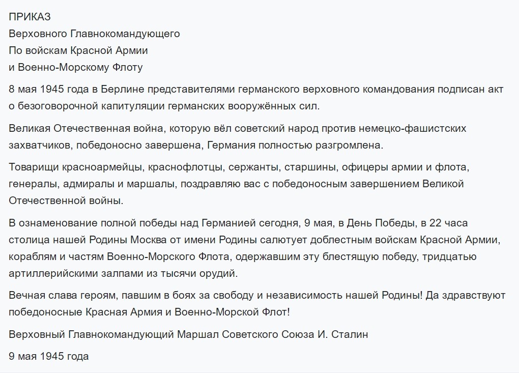 大致意思为:“1945年5月8日,德方在柏林签署无条件投降法令。苏联人民取得了卫国战争的伟大胜利。同志们,士兵们,军官们,将军和元帅,祝贺你们以胜利结束战争。为了纪念今天,5月9日,在我们的首都莫斯科,22点整,代表祖国向英勇的红军部队、海军致敬,鸣放礼炮。永远感谢为祖国的自由和独立而斗争的英雄们。红军、海军万岁。苏联最高统帅、元帅,斯大林。”