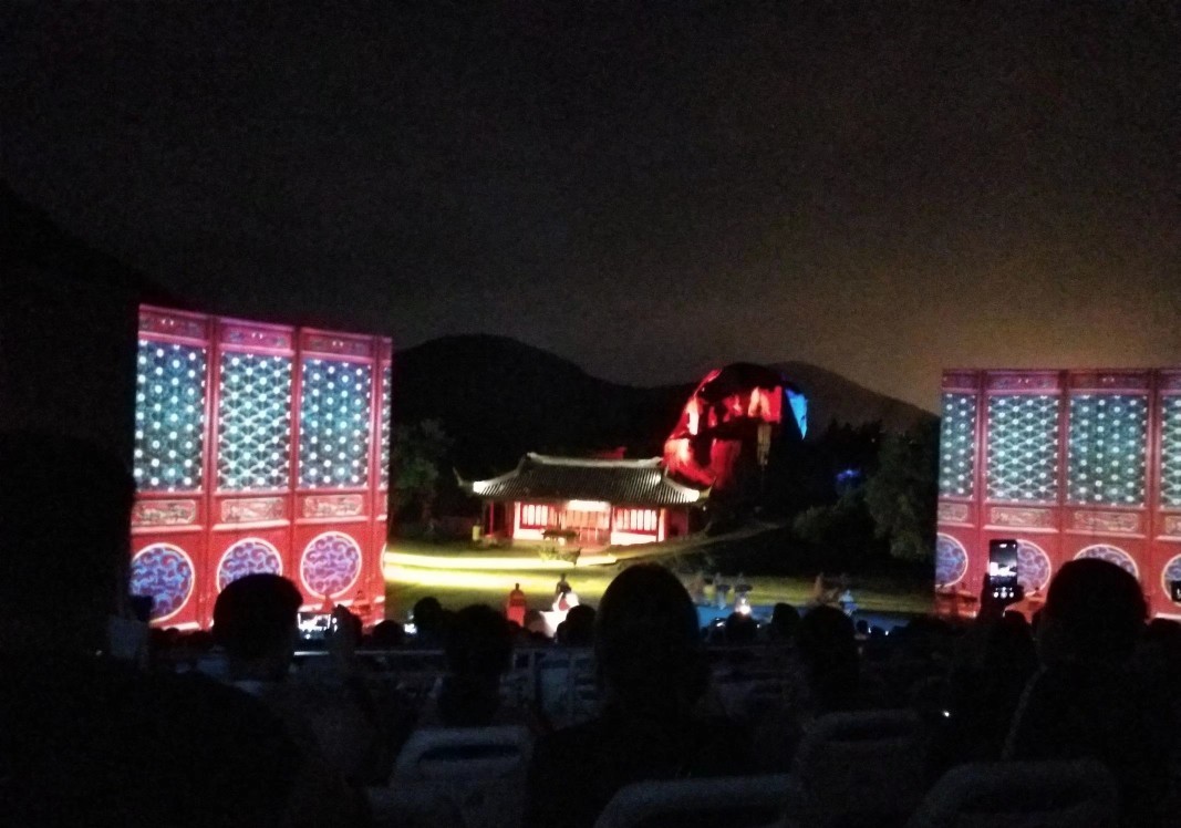 类似杭州的“宋城千古情”,是大型演出,只有晚上才有,下雨天不开。