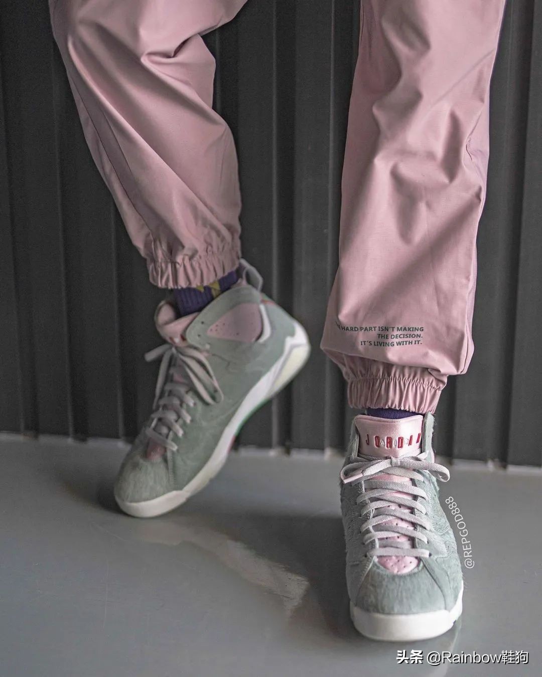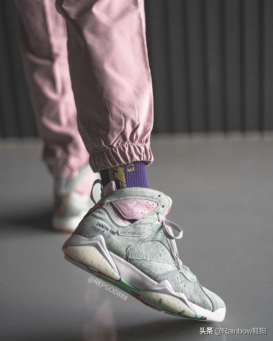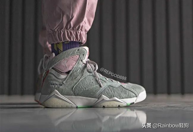 以上是 IG 用户 @repgod888 带来的 AJ7 兔八哥2.0上脚图,确实好看。马毛材质的使用让这双鞋实物看起来质感很独特,配色的组合也“刚刚好”,虽然在部分颜色上选用了最粉嫩的那一种粉色,但并不会喧宾夺主影响大家把重点放在层次感很足的鞋面上。