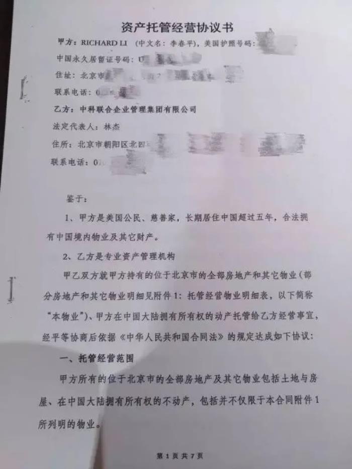 2016年6月,以前深得李春平信任的刘长志,把李春平在国内的几亿固定资产托管给了中科联合企业集团管理有限公司(简称中科)。