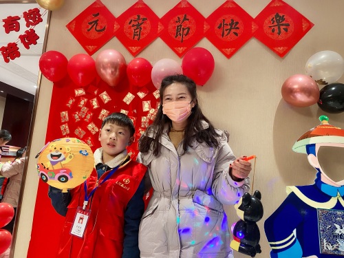 “木兰之子(打一食物)”“我知道啦,是花生。”隆庆祥政和花园、民权路店内,小记者们你一言我一语,在一片欢声笑语中,灯谜被一个个解开。小记者们凭借自己的智慧获得了活动大奖——象征着团圆、喜庆的红灯笼,心里无比自豪。