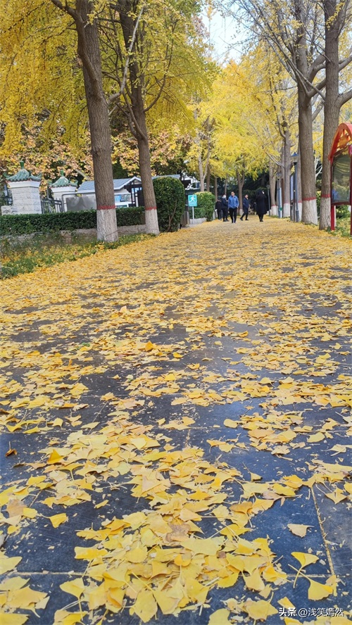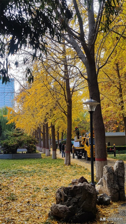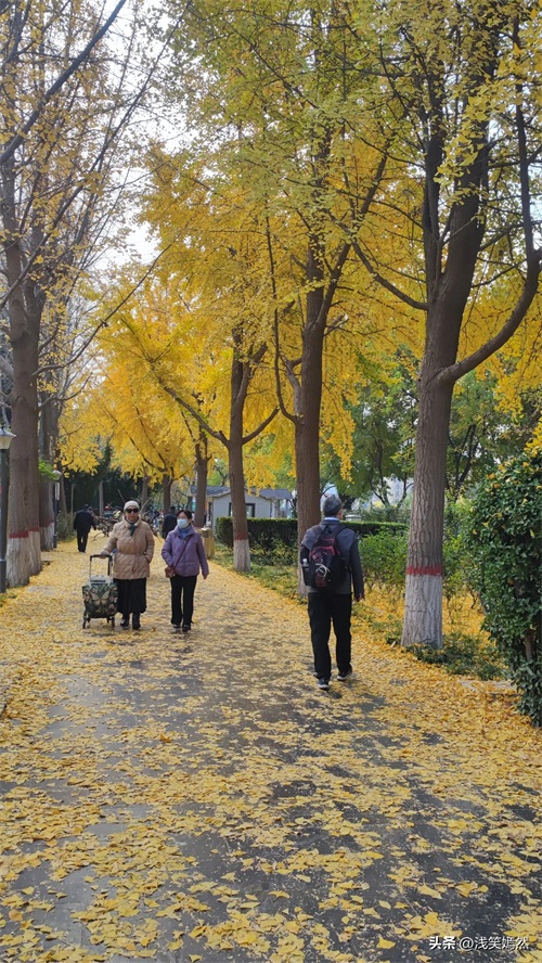 公园的主路有一条银杏大道,金黄的叶子铺在地上厚厚的一层,树上也还有不少,吸引市民前来打卡拍照。