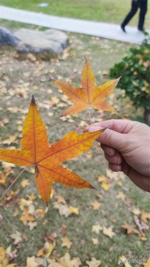 公园的平安山上、湖边还有东面的绿地上有几棵元宝枫,有的叶子半绿,有的金黄,有的半红,有的深红,正在渐变中,非常的漂亮。