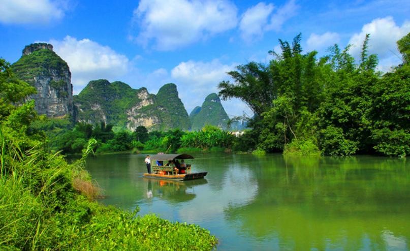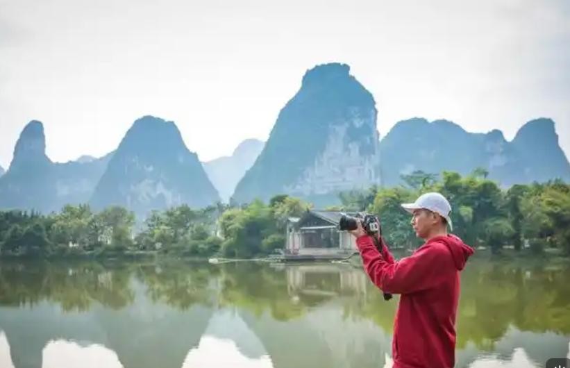 • 山水田园相依,喀斯特山峰倒映在碧绿的河水中,形成极具层次感的美景。