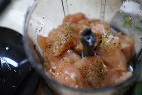 买来的鸡胸肉切小块,加盐、五香粉、干葱粉和蛋清等调味料,搅打成泥后可以放上任何喜欢的配菜。