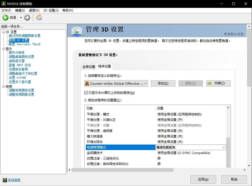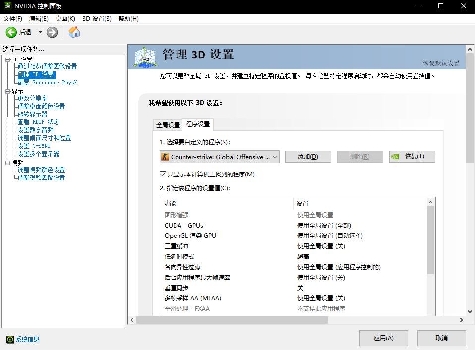 2:找到你的NVIDIA控制面板 点管理3D设置 找到程序设置 选择CSGO