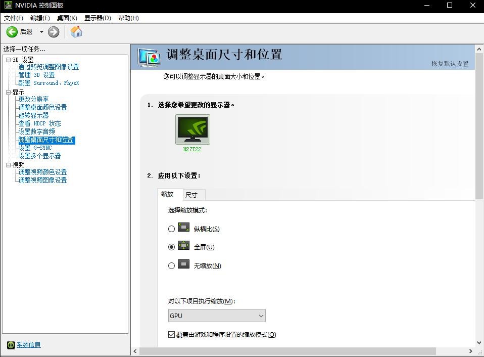 NVIDIA控制面板 调整桌面尺寸和位置选项 这里选择 全屏 然后应用