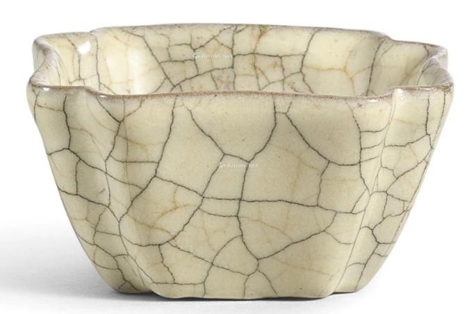 此式四方倭角,葵口雅致器形,为南宋特有。北京故宫博物院藏一件倭角水洗,与本品相类,釉色更青,单色开片,近口沿处略显柔曲,底作四足,定为官窑,刊于《故宫博物院藏文物珍品全集:两宋瓷器(下)》,北京,1996年,图版21;另有一件五瓣葵口哥窑洗,录于《故宫宋瓷图录:龙泉窑、哥窑及其他民窑》,台北,1974年,图版58。