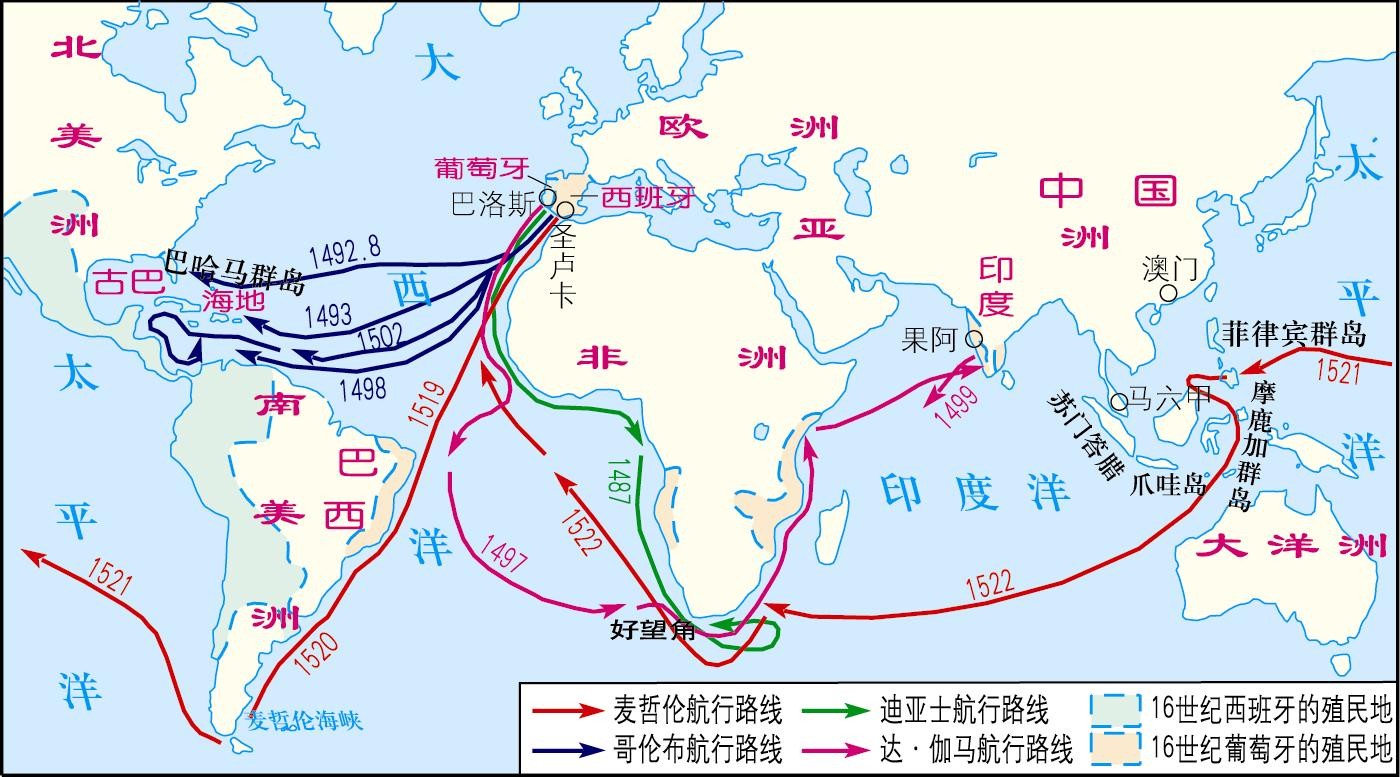 1519——1522年,麦哲伦船队在西班牙王室的支持下,一路向西航行,第一次实现了环球航行。