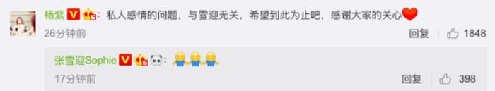 而对于分手的原因,杨紫也表示“没有出轨”,与张雪迎无关。