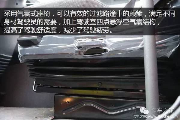 主驾采用气囊式座椅,可以有效的过滤路途中的颠簸,满足不同身材驾驶员的需要。加上驾驶室四点悬浮空气囊结构,提高了驾驶舒适度,减少了驾驶疲劳。