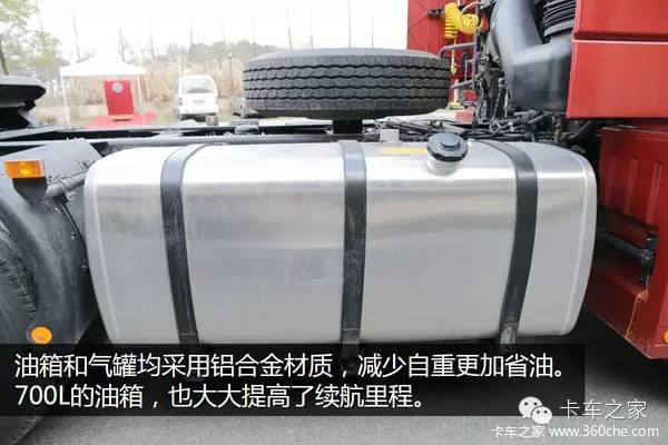 油箱和气罐均采用铝合金材质,减少自重更加省油。700L的油箱,也大大提高了续航里程。