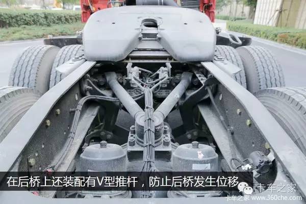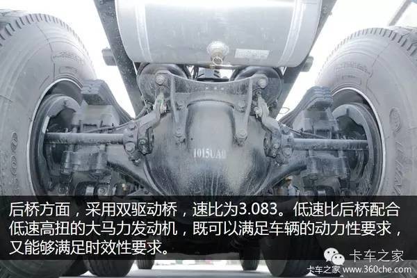 后桥方面,采用双驱动桥,速比为3.083。低速比后桥配合低速高扭的大马力发动机,既可以满足车辆的动力性要求,又能够满足时效性要求。
