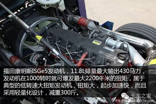 动力方面,欧曼GTL超能版搭载的是福田康明斯ISGe5发动机,11.8L排量最大输出430马力,发动机在1000转时就可爆发最大2200牛米的扭矩,属于典型的低转速大扭矩发动机,扭矩大,起步加速快,而且它更加轻量化,减重300斤。