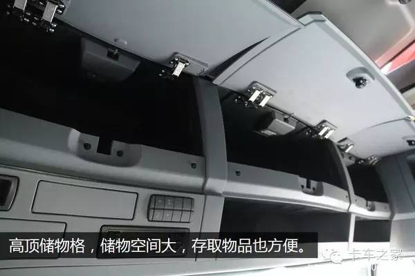 储物空间大,也多。在卧铺两侧有小型储物格,可以放一些体积小的物品,如休息时用来打发时间的报纸等,卧铺抽拉式储物格,可以放一些随车的修理工具,操作方便,美观实用。