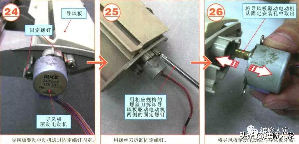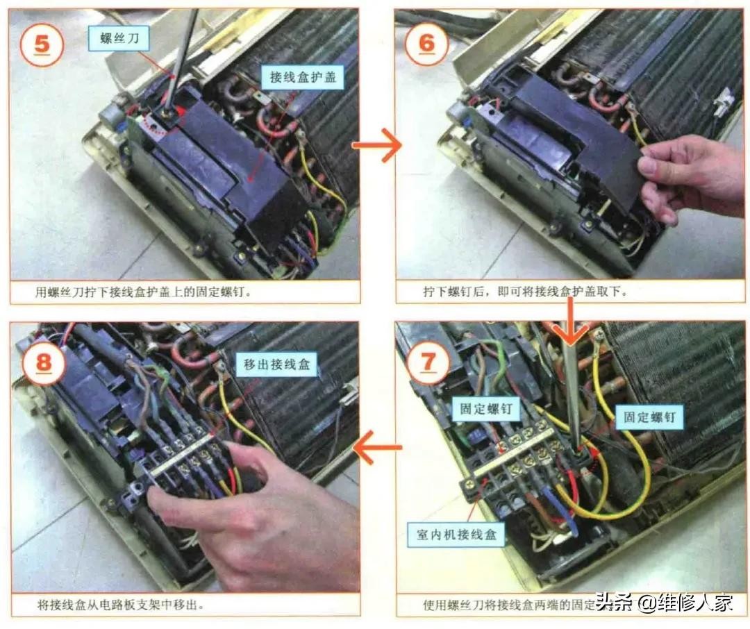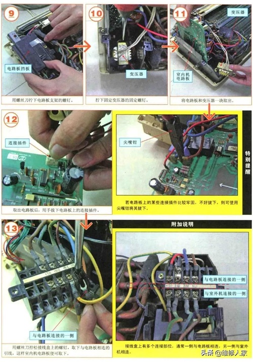 室内机外壳拆下后,就可以看到室内机的各个主要部件了。其中,空调器工作的核心控制部件一般集中安装在室内机的一侧,此处涉及的零部件较多,拆卸时需要讲究顺序和技巧,具体拆卸过程如下图所示。