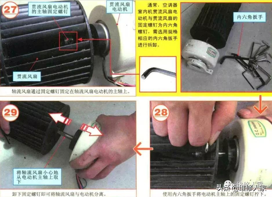 通常,空调器室内机贯流风扇电动机与贯流风扇的固定螺钉为内六角螺钉,需选用规格相应的内六角扳手进行拆卸。