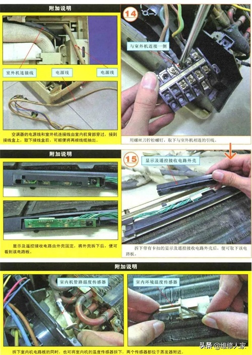 空调器的电源线和室外机连接线由室内机背部穿过,接到接线盒上,取下接线盒后,可顺便将两根线缆抽出。显示及遥控接收电路由外壳固定,将外壳拆下后,便可看到该电路板。拆下带有卡扣的显示及遥控接收电路外壳后,便可取下该电路板。拆下室内机电路板的同时,也可将室内机的温度传感器拆下,两个传感器都位于蒸发器附近。