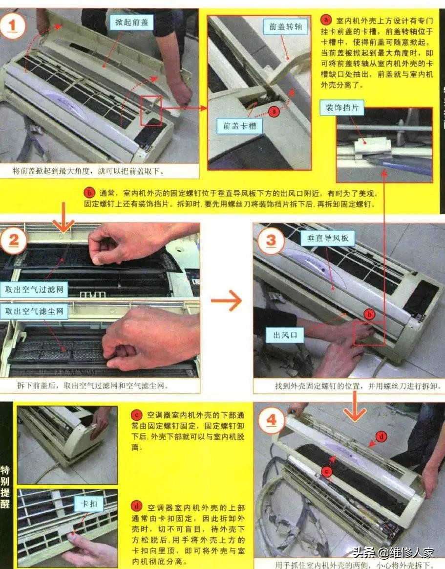 检查和维修空调器故障时,需要对空调器进行拆卸,以便找到需要维修的部位。下面以典型分体挂式空调器为例,演示一下室内机外壳的拆卸过程。