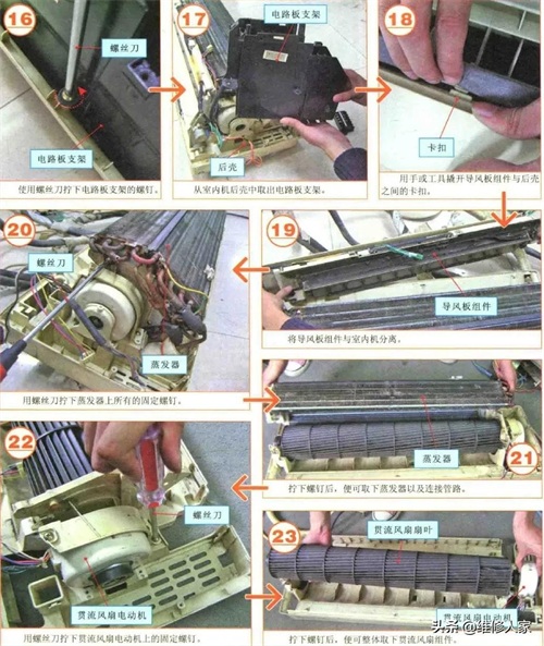 接下来将拆卸室内机风扇组件和蒸发器等组成部件。空调器中的导风板组件、贯流风扇组件都是由多个部件安装连接而成的,在实际检修时,首先要将这些组件分离,再分别进行细致拆卸。下图为室内机风扇组件和蒸发器的分离拆卸步骤。