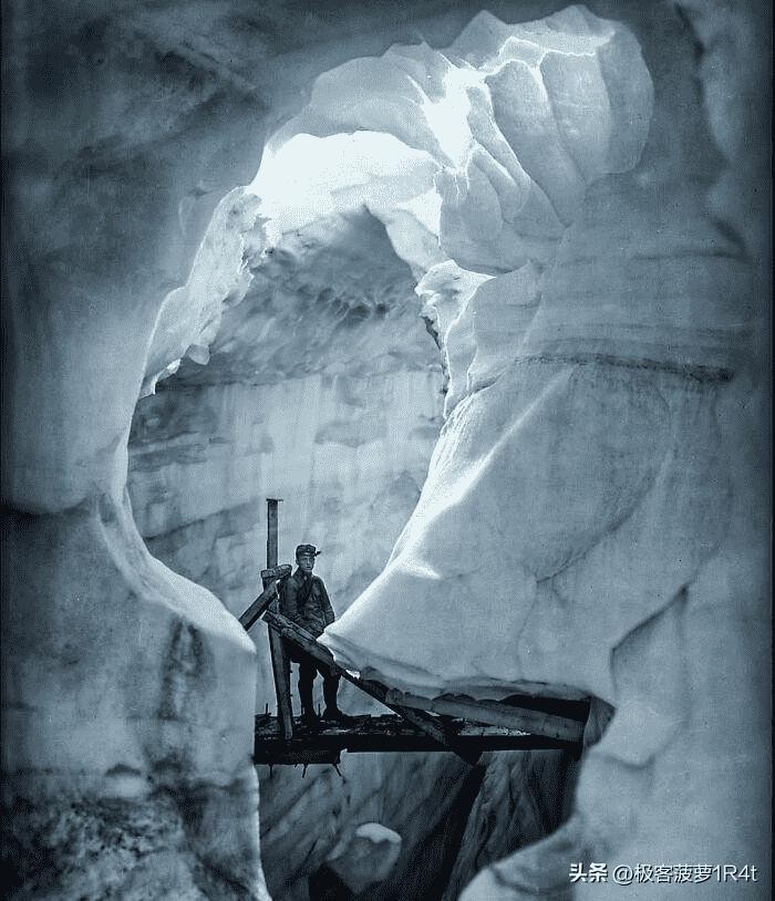 奥匈帝国军队的一名年轻士兵站在叹息桥上,一座连接马尔莫拉达冰川内隧道的桥。
