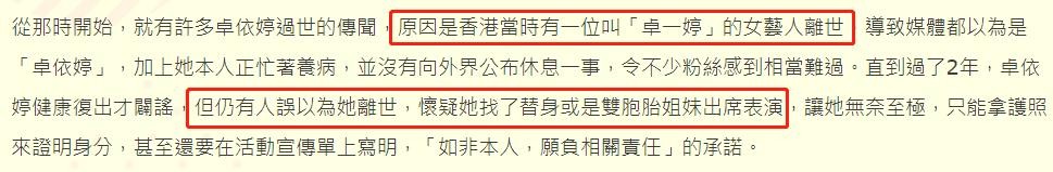 谣言传了又传,许多喜欢她的粉丝伤心不已,即使卓依婷后来复出辟谣,也没能让所有人相信,甚至发新专辑的“她”还被怀疑是替身或者双胞胎妹妹假扮的。