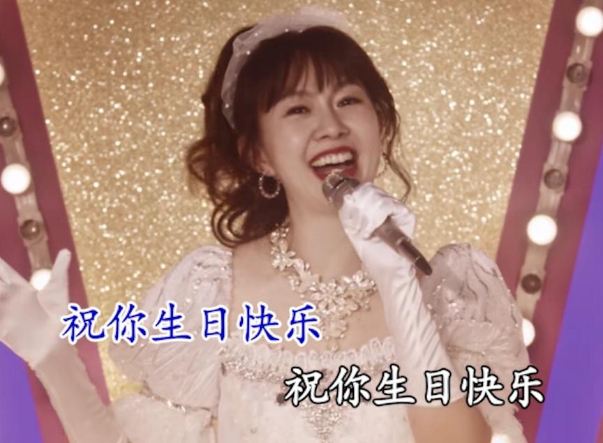 这次卓依婷唱的是《生日快乐》,画面一开始她站在台上,头戴发箍,穿着白色泡泡袖蓬蓬裙,手上还有白手套,戴的耳环项链都比较夸张,整体风格非常复古。她脸上没什么皱纹,笑容甜美,看着显年轻。