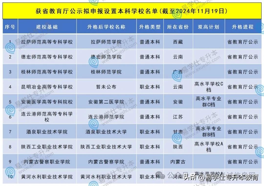 还有多所院校,今年以来升本动作频频,截止2024年12月2日,已经有52所专科院校,获得省教育厅公示拟申报设置为本科院校。