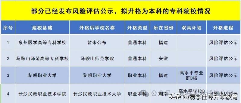 还有几所院校,已经发布风险评估公示,下一个环节就是省教育厅公示阶段,距离升本成功还有2步要走。