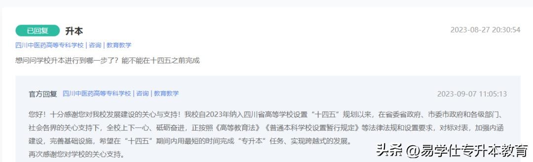 其实很多专科院校都有升本的动作,比如大家很关注的四川中医药高等专科院校升本问题。