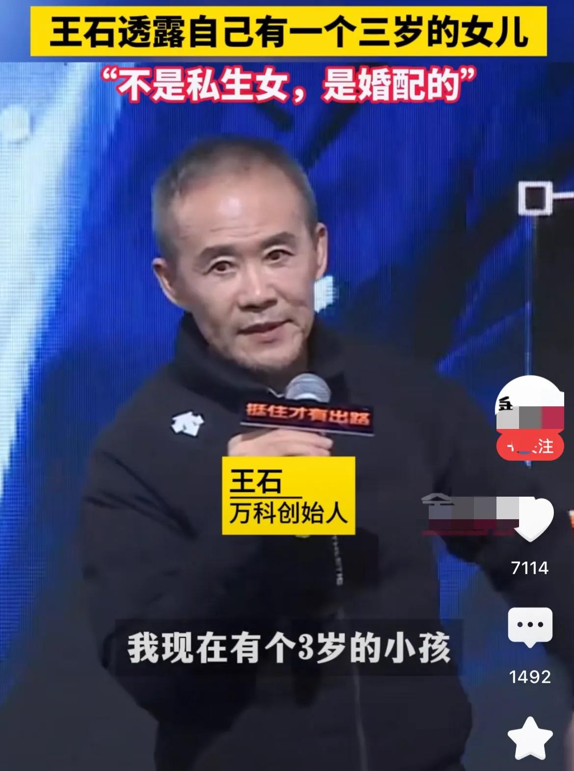 王石在参加活动时,自曝有一个3岁的孩子。王石还特别强调不是私生女,是婚配所生。