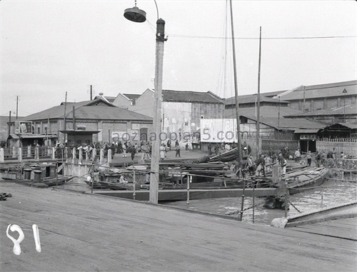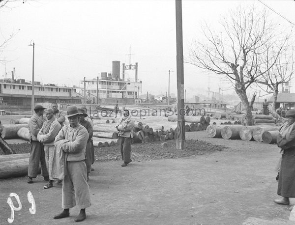 1933-34年浦东,华通码头,工人和卸下来的原木。