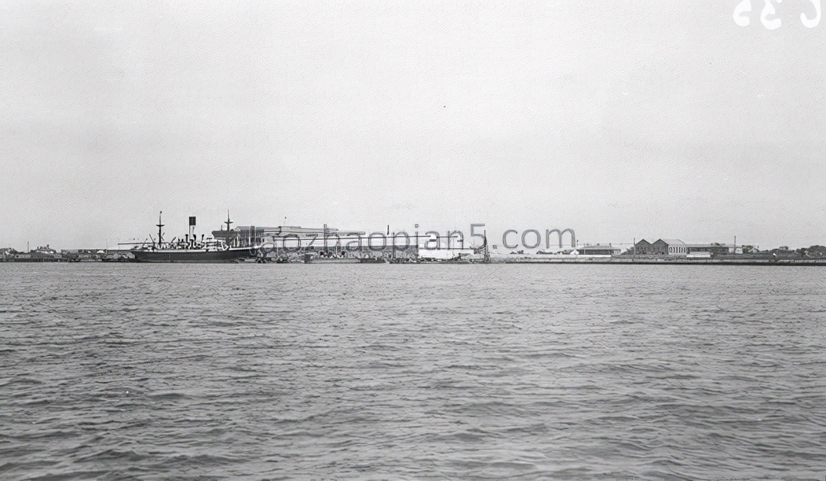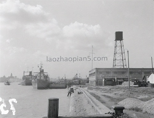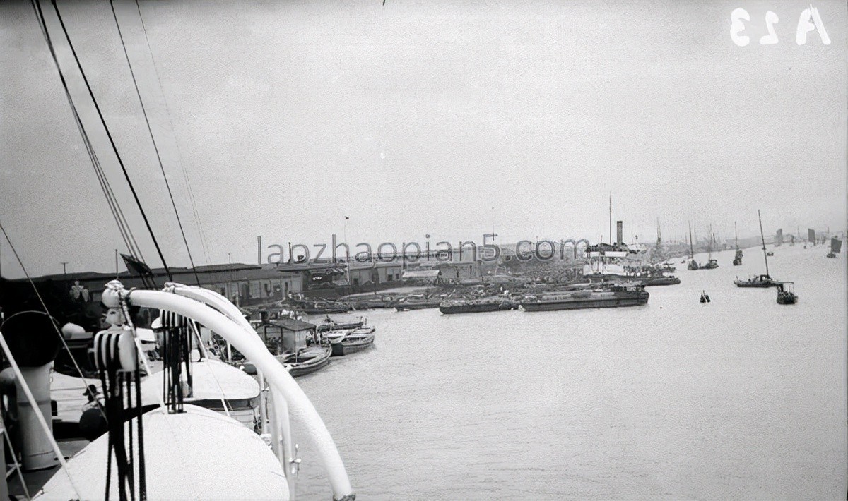 泊靠在蓝烟囱码头的轮船,轮船烟囱上漆有一圈十分醒目的蓝色,辨识特征明显。照片左侧为浦东洋泾港。