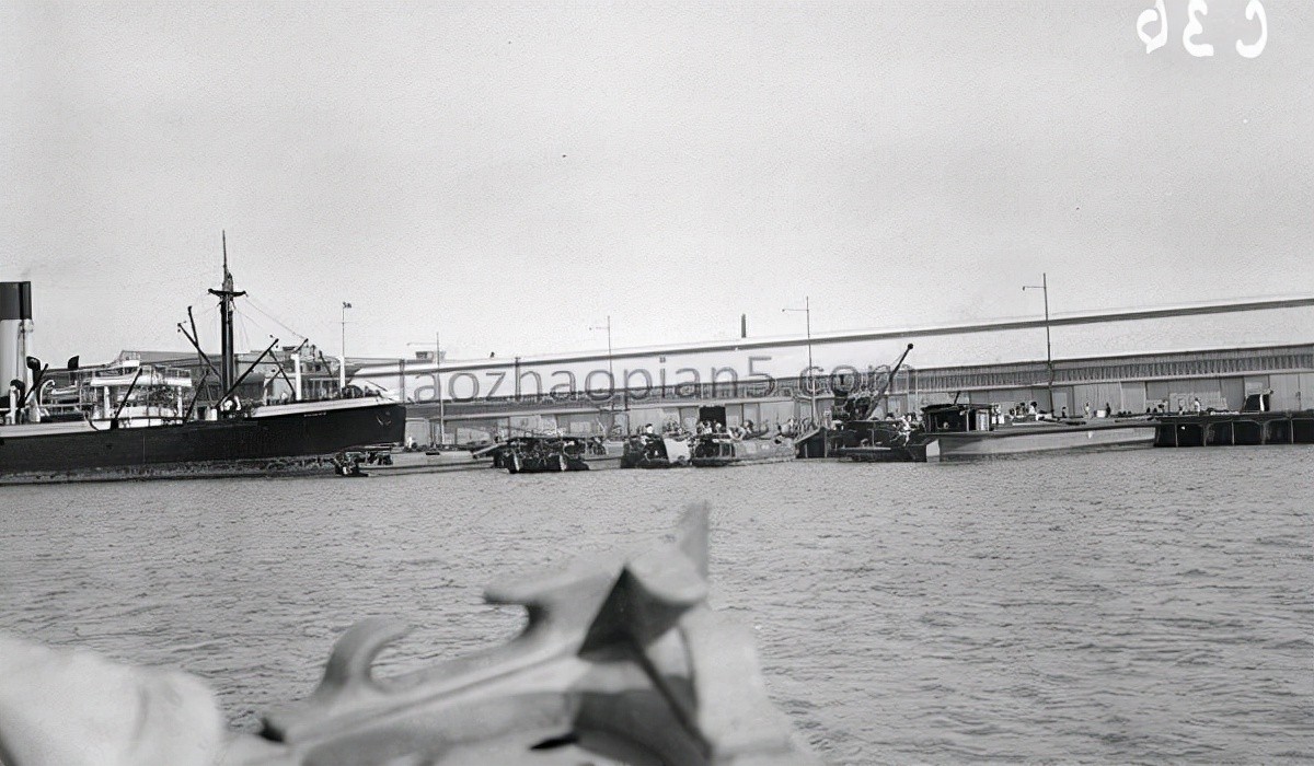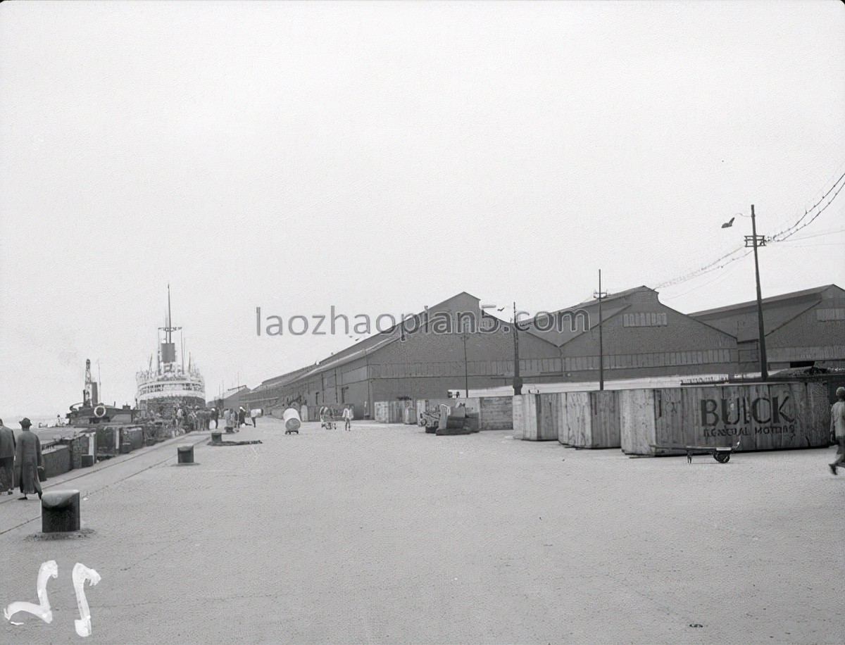 1940年 浦东,蓝烟囱码头上码堆着通用汽车销往中国的别克汽车装箱。