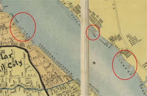 民国二年(1913年)商务印书馆实测上海城厢租界地图中标注的浦江两岸三处太古码头