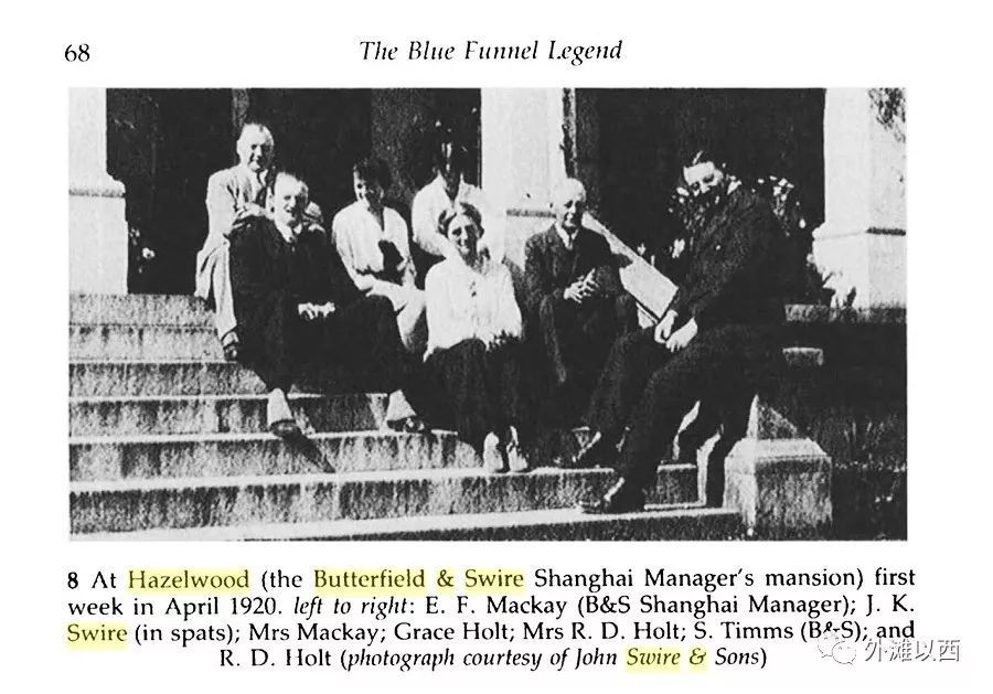 英国布里斯托大学中国老照片项目有”太古洋行相册“,Hazelwood, Seymour Road, Shanghai,这两张照片里的大宅会在西摩路。这栋豪宅的第一位主人是当时的上海太古洋行总裁麦凯(E. F. Mackay),他1892年在伦敦加入太古洋行。曾分别在该洋行香港、天津及上海分行工作。后任该行上海分行大班, 来上海后又兼任英商上海商会主席五年。在1920—1924年曾任上海公共租界工部局董事, 其间还在1921年任副总董。还担任过数年上海仁济医院院长。1920年4月某个晴天,麦凯在榛木府邸旧宅与朋友聚会留影纪念,出席者中有一位J.K.Swire,施怀雅家族成员,未查到他上海史料。