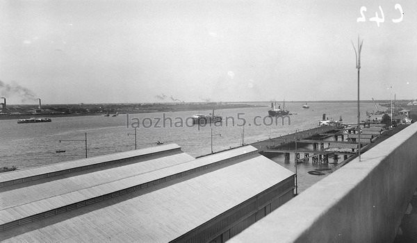 在仓库楼顶上朝东北方向望向浦江下游,对岸杨树浦一带的码头、工厂绵延不绝,林立的烟囱吐着黑烟。