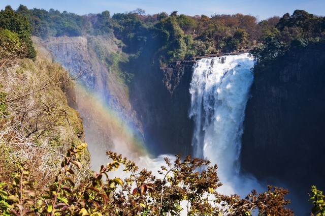 第二是非洲的维多利亚瀑布。维多利亚瀑布位于非洲津巴布韦和赞比亚交界处的赞比西河上,宽1708米,高达128米,是世界上最大的瀑布。瀑布附近常年腾起雾气,远远望去,就像一道银色的帘幕,又称“烟囱瀑布”。瀑布水流有如万马奔腾,浩浩荡荡,十分壮观。站在观瀑平台上,会感到一阵阵的水汽扑面而来。如果乘坐小船靠近瀑布下方,还可以体会到滔天的水流给人的强大冲击力。维多利亚瀑布以其宽广与高大而著称于世,是大自然鬼斧神工的杰作。