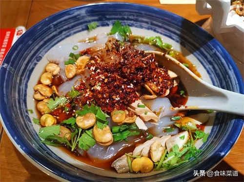 选用优质土豆淀粉为主要原料,经过多道工序精制而成,豆腐干和蚕豆的加入,使得凉粉口感更加丰富,既有豆腐干的细腻,又有蚕豆的香脆。