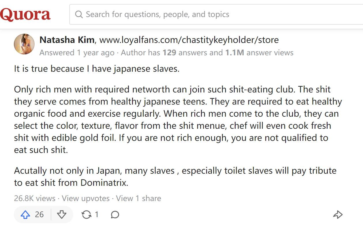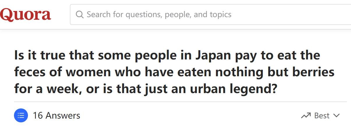 例如,美国版知乎上有这样一个问题:日本有人花钱吃女性的粪便,并且要求她们提前一周只吃水果,这是都市传说还是真的。