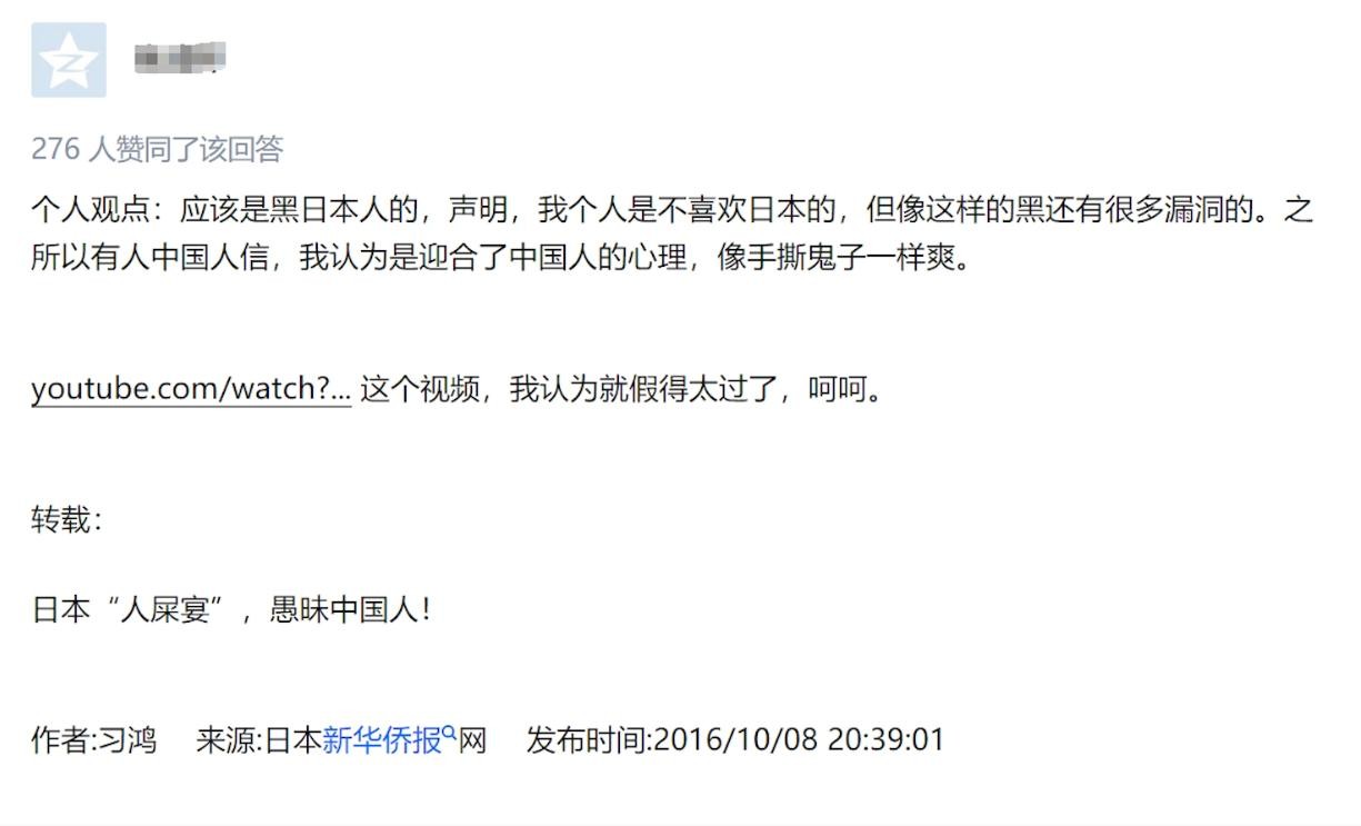 然后下面贴上了2016年10月8号,日本新华侨日报发布的辟谣文章,标题是日本“人屎宴”,愚昧中国人!