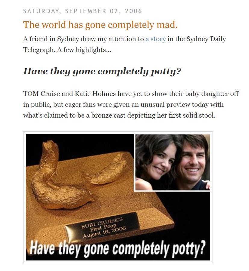 根据他们的说法和我的核查,金屎宴的文章最早出现在2004年,一开始是没有图片的,只是文字流传。后来网上出现的金屎宴图片还有价目表都是假的,前者是美国一个艺术家,根据影星汤姆克鲁斯的女儿第一次大便的造型做的艺术品。