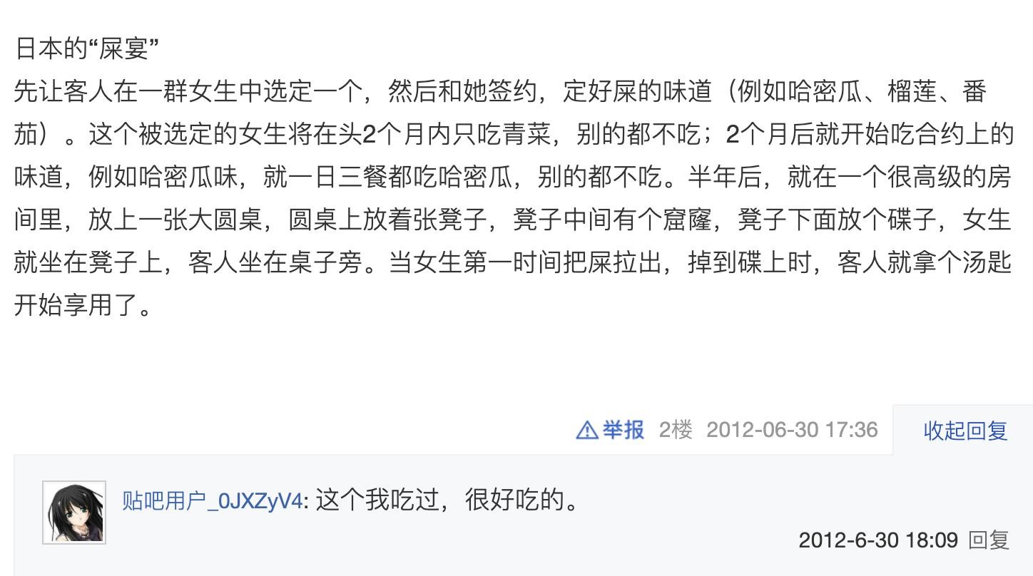 还有网友说:他认识一个非常有钱的日本人,而这个日本人曾经带了一个女人到网友家里,只为吃到女人的草莓便便,而且这个日本人还说味道很好。