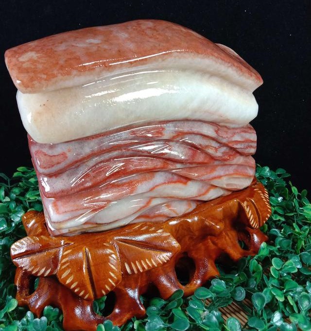 在地质运动过程中猪肉石与其他矿物质接触色化而成,因为其层次分明和酷似“五花肉”的颜色。