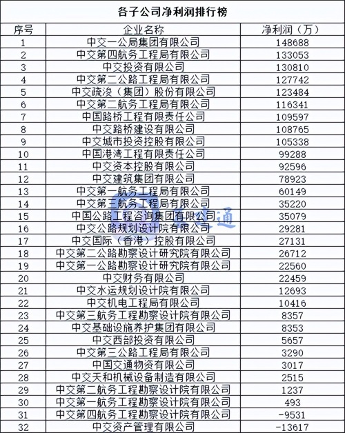 各工程局净利润排名:中交一公局>中交四航局>中交二公局>中交二航局>中国路桥>中交路建>中国港湾>中交建筑集团>中交一航局>中交三航局>中交三公局;