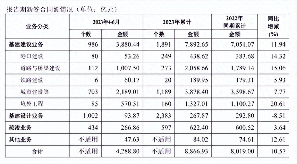 2023上半年,中国交建实现营业收入3657.88亿元。归属于公司股东的净利润为114.03亿元,扣除非经常性损益后归属于公司股东的净利润为109.50亿元,每股收益为0.66元。实现新签合同额8866.93亿元,同比增长10.6%。截至2023年6月30日,在执行未完工合同金额为38066.86亿元。
