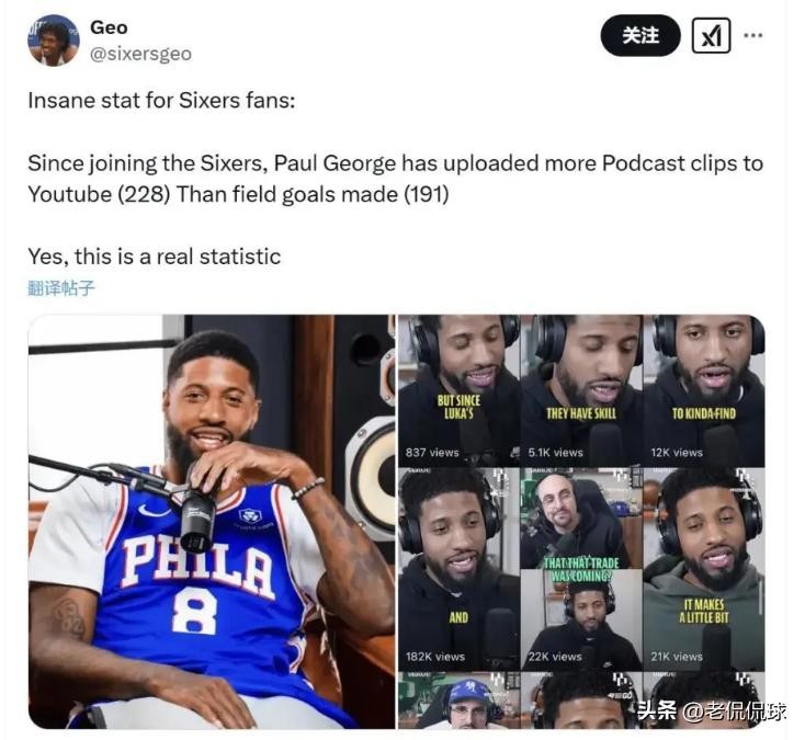 此外,更让人诧异的是,本赛季乔治有多达9场比赛投篮命中率低于30%,对阵篮网时甚至仅得2分,简直就是离谱到家了;赛季前半段,乔治的播客视频更新频率甚至超过了他的精彩进球集锦,引起费城球迷不满,最终他不得不在2月宣布暂停播客节目。并且,伴随着年龄的增加,乔治的伤病也开始如影随形,根据费城官方数据统计,乔治本赛季因左膝积液和腹股沟拉伤总计缺席了多达41场比赛,全明星赛前曾连续5场比赛依靠止痛针带伤出战,虽说精神可嘉,但是隐患也是巨大,据医学专家评估,其下赛季身体状态也值得担忧。